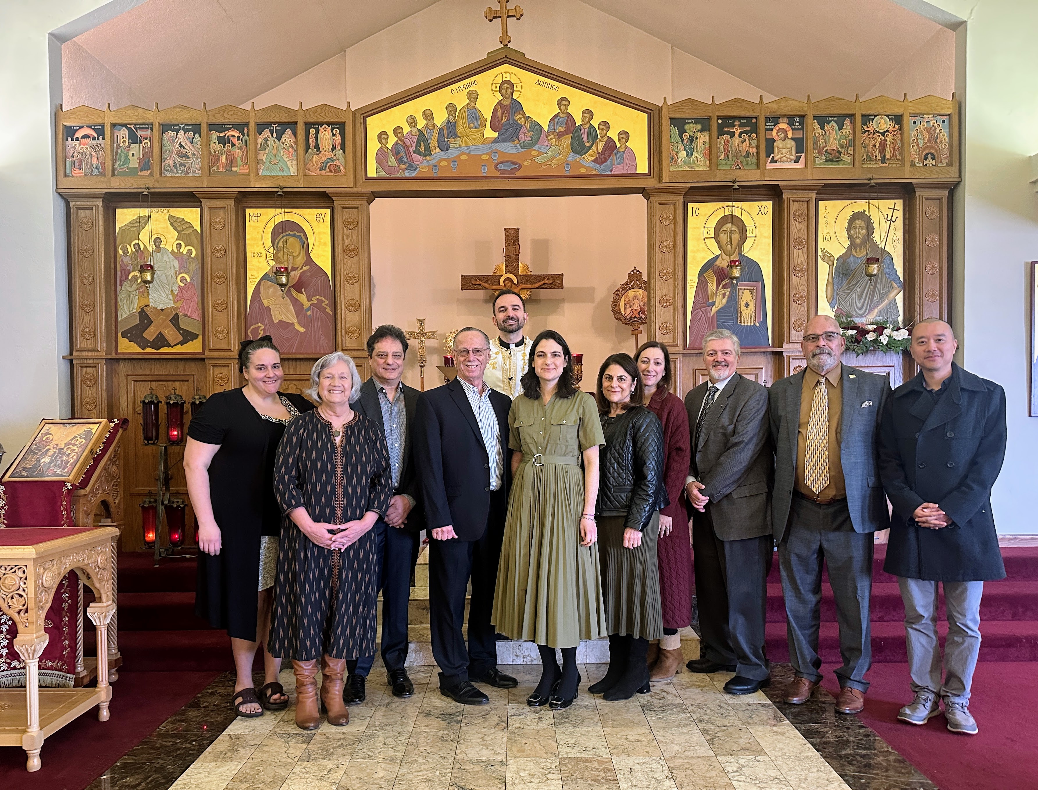 (Pictured left to right): Nicolette Efstathiou, Karen Ries, Nick Vriheas, Gary Wallner, Father Niko Bekris, Elena Liveris, Elizabeth (Lizz) Karbo, Heba Khoury, George Psefteas, Leonidas Petsas, and Calvin Ho. Not Pictured: Marino Mamoulelis and Kim Spencer.
